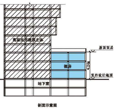 在高层建筑主体投影范围外,与建筑主体相连且建筑高度不大于24m的附属建筑。