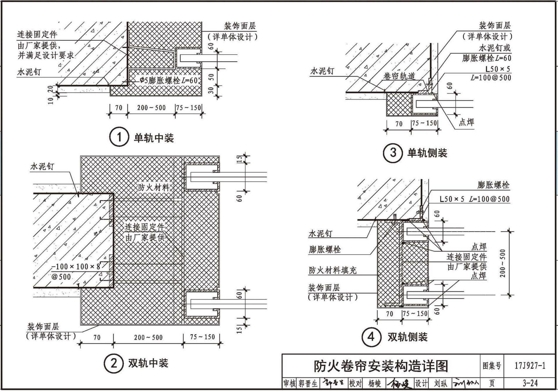 2020.11 月出版的《17J927-1 车库建筑构造》中增加了防火卷帘的参考图。(3-23,3-24)